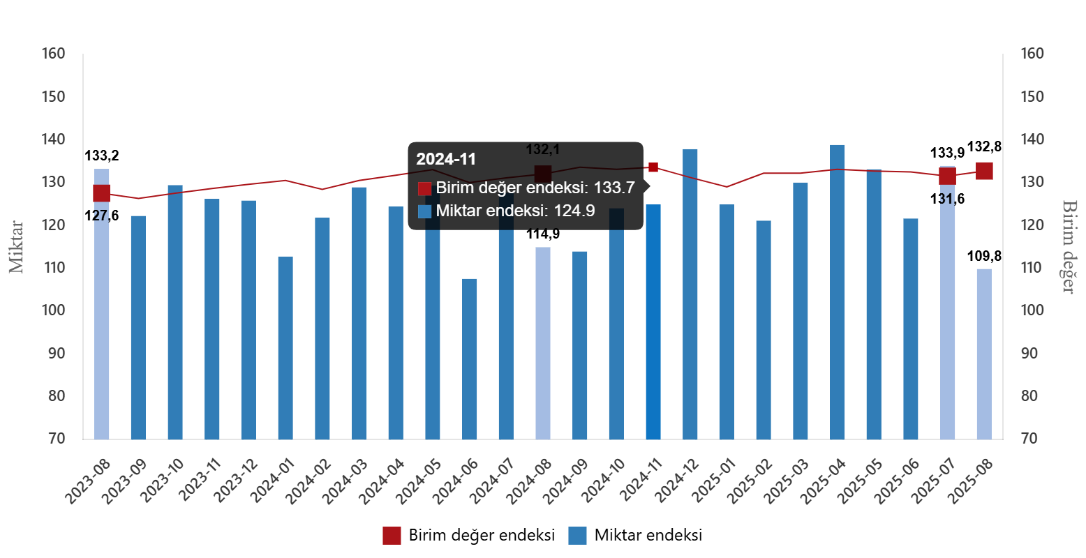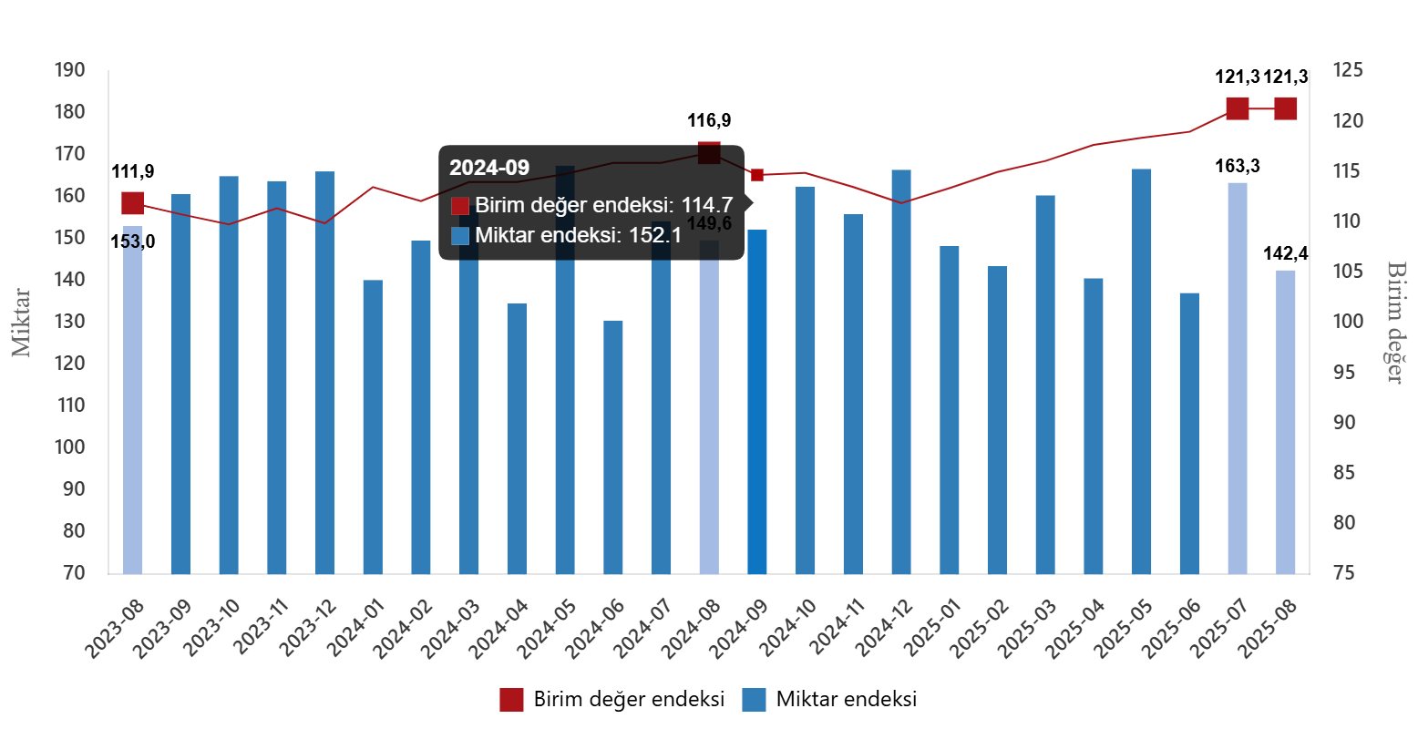 Mevsim ve takvim etkilerinden arındırılmış seriye göre ihracat miktar endeksi; 2025 Temmuz ayında 157,4 iken 2025 Ağustos ayında %2,8 oranında azalarak 152,9 oldu. Takvim etkilerinden arındırılmış seriye göre ise ihracat miktar endeksi; 2024 yılı Ağustos ayında 147,5 iken 2025 yılı Ağustos ayında %0,9 oranında azalarak 146,1 oldu.