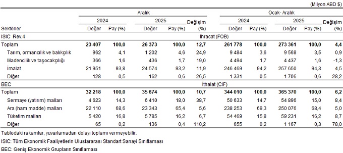 Dış Ticaret İstatistikleri, Aralık 2025