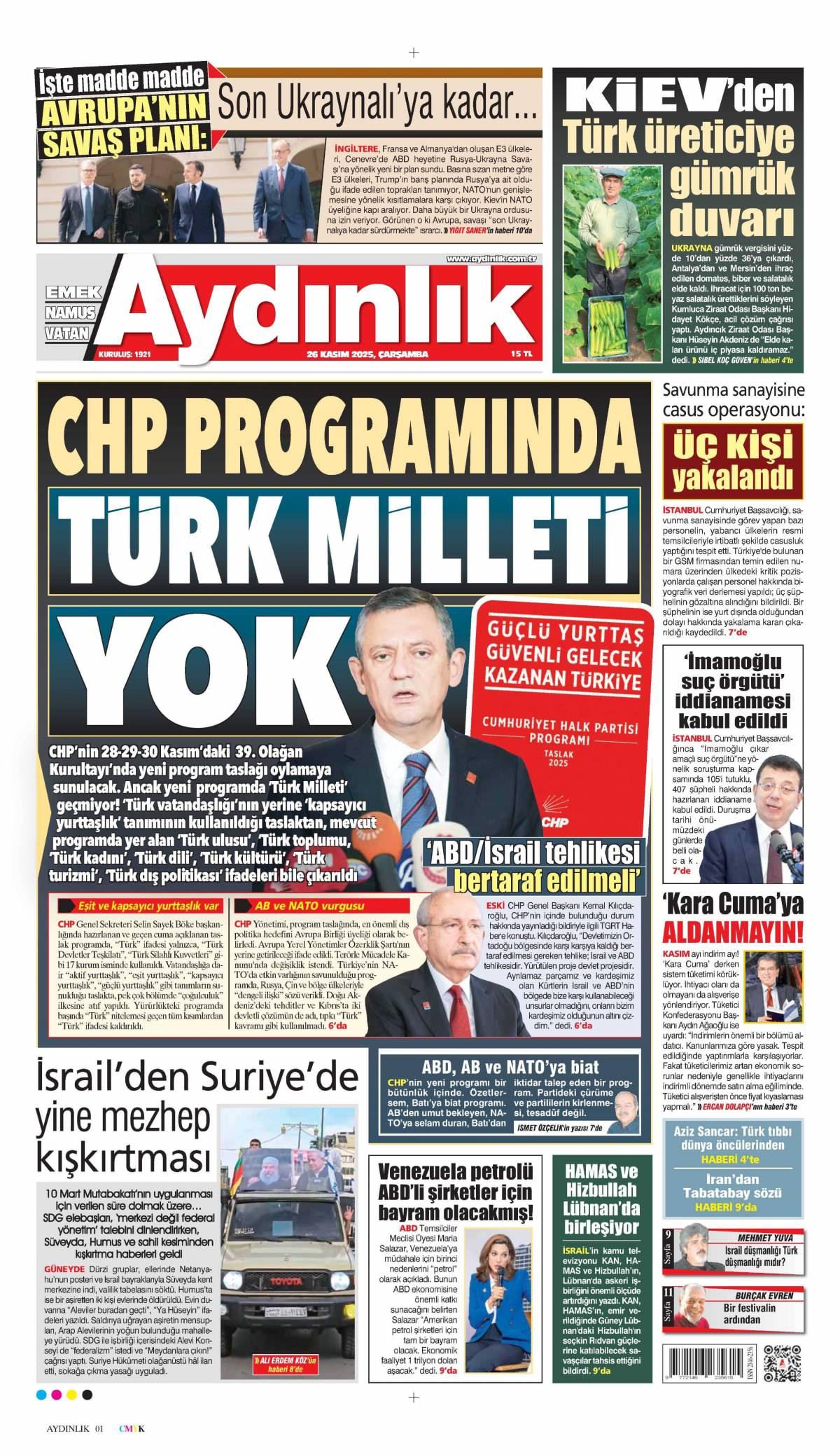Aydınlık Gazetesi 27 Kasım 2025 Günü Manşeti