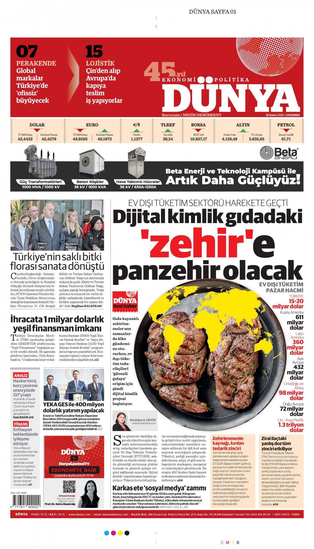 Dünya Gazetesi 27 Kasım 2025 Günü Manşeti