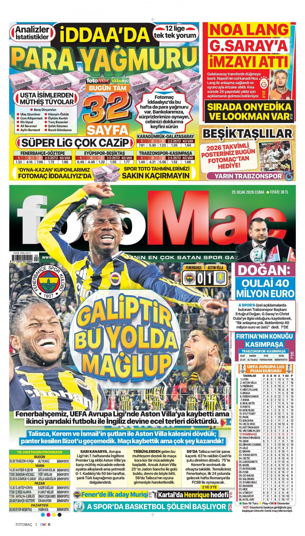 Fotomaç Gazetesi 24 Ocak 2026 Günü Manşeti