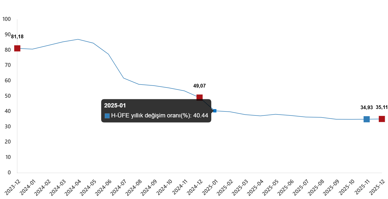 H-ÜFE 2025 yılı Aralık ayında bir önceki aya göre %0,78 artış, bir önceki yılın Aralık ayına göre %35,11 artış, bir önceki yılın aynı ayına göre %35,11 artış ve on iki aylık ortalamalara göre %36,78 artış gösterdi.