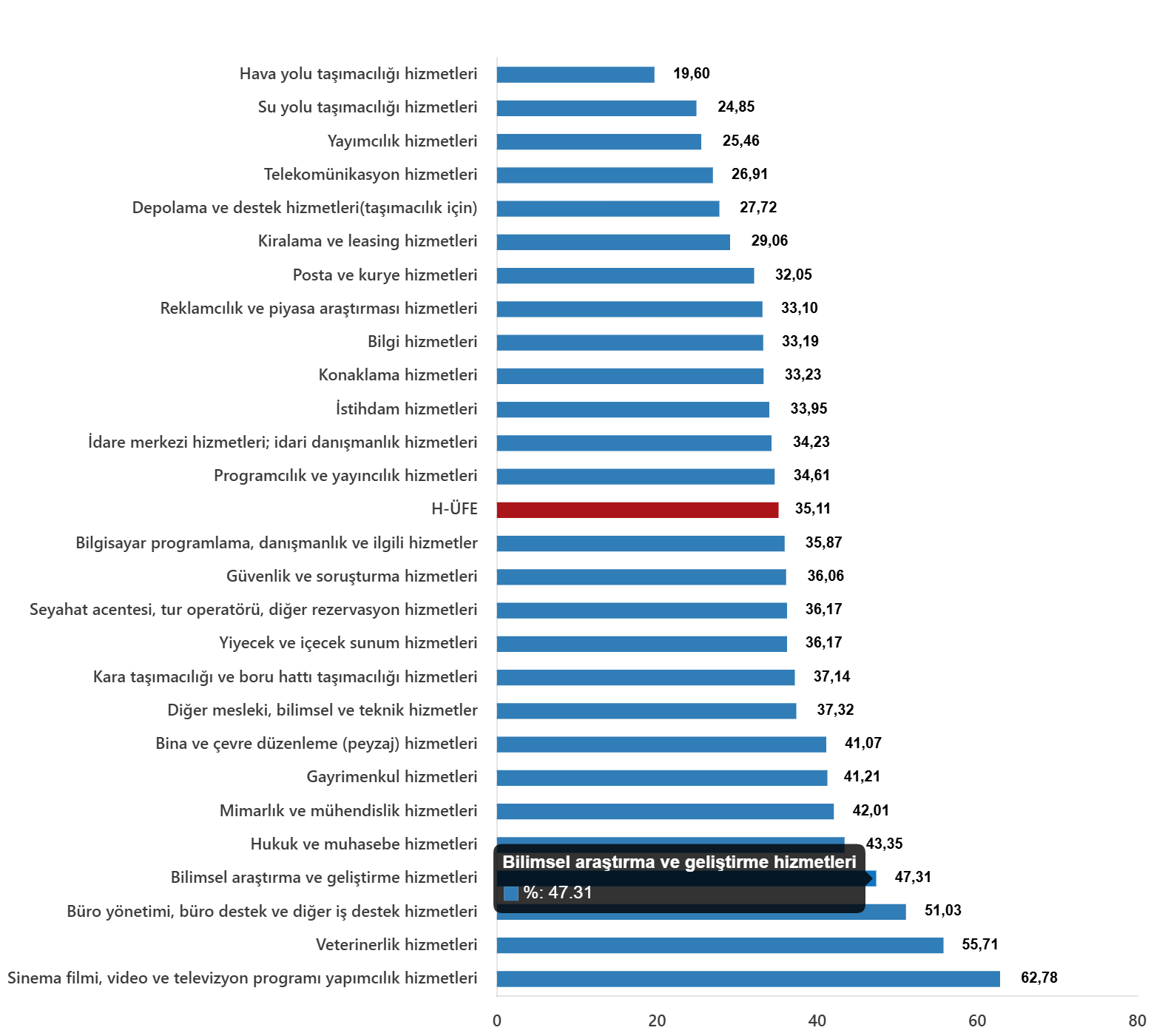 Bir önceki yılın aynı ayına göre, ulaştırma ve depolama hizmetlerinde %32,32 artış, konaklama ve yiyecek hizmetlerinde %35,46 artış, bilgi ve iletişim hizmetlerinde %34,32 artış, gayrimenkul hizmetlerinde %41,21 artış, mesleki, bilimsel ve teknik hizmetlerde %40,33 artış, idari ve destek hizmetlerde %37,92 artış gerçekleşti.