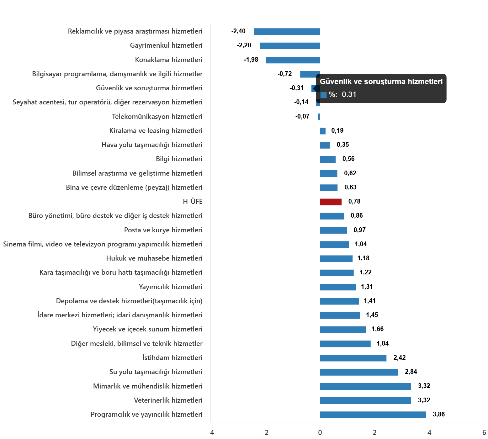 Bir önceki aya göre, ulaştırma ve depolama hizmetlerinde %1,23 artış, konaklama ve yiyecek hizmetlerinde %0,77 artış, bilgi ve iletişim hizmetlerinde %0,05 azalış, gayrimenkul hizmetlerinde %2,20 azalış, mesleki, bilimsel ve teknik hizmetlerde %1,25 artış, idari ve destek hizmetlerde %0,59 artış gerçekleşti.
